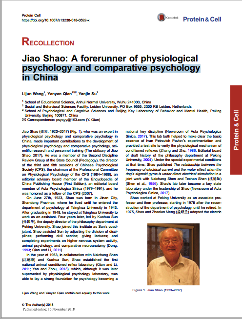 王礼军:Jiao Shao: A forerunner of physiological psychology and comparative psychology in China