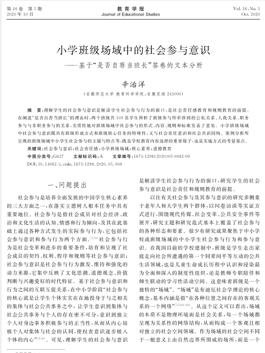 【教师科研】辛治洋:小学班级场域中的社会参与意识——基于“是否自荐当班长”答卷的文本分析