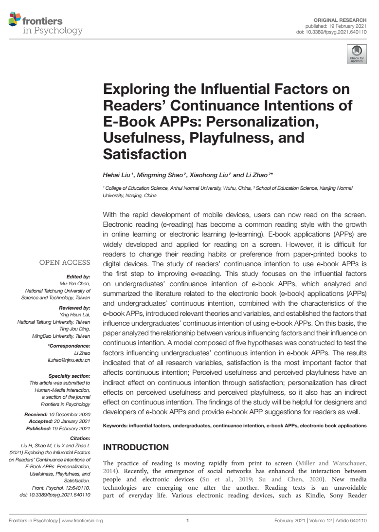 【教师科研】刘和海:Exploring the Influential Factors on Readers' Continuance Intentions of E-Book APPs: Personalization, Usefulness, Playfulness, and Satisfaction