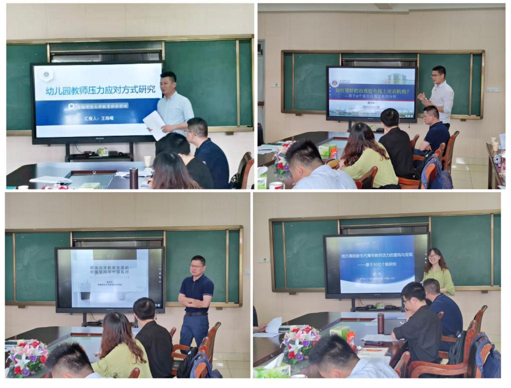 王路曦、吴文涛、薛卫洋、江珊等四位老师,基于前期相关研究,分别作了题为《幼儿园教师压力应对方式研究》《如何更好地治理校外线上培训机构——基于28个省市政策文本的分析》《跨境高等教育发展的价值取向与中国应对》《地方高校新生代青年教师活力的重构与呈现——基于30位个案研究》的汇报,报告史料丰富、逻辑清晰、语言凝炼、观点鲜明。