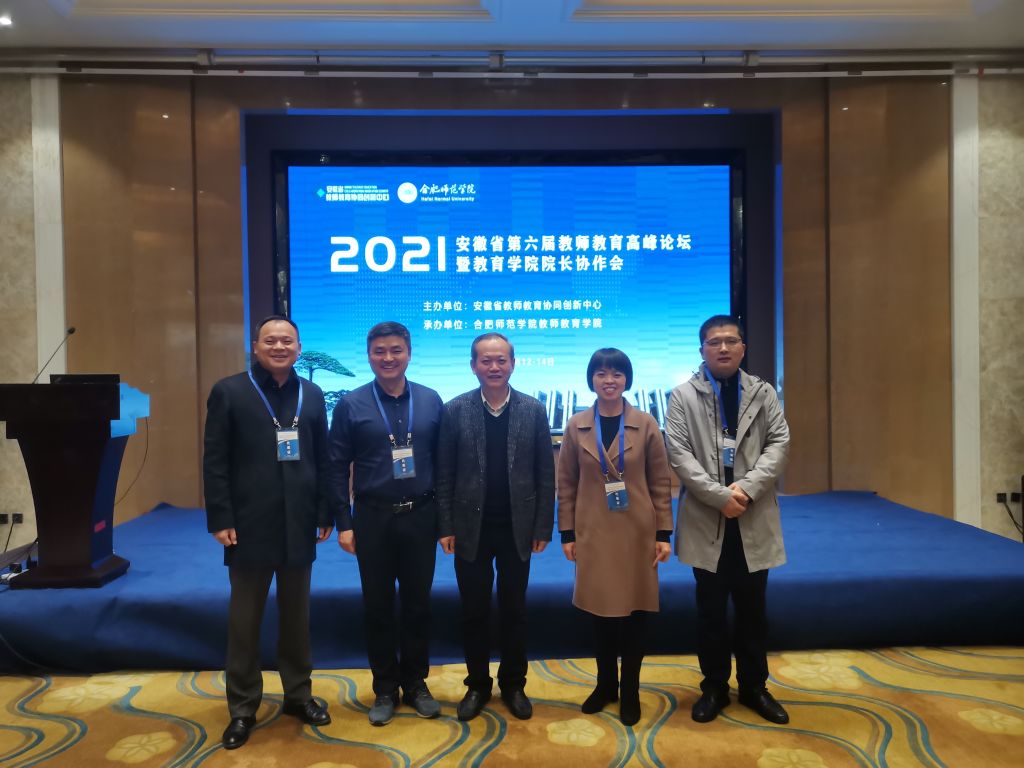 本网讯(教科院 李卯)为进一步建设安徽省高质量教师教育体系,加强高校教育学院之间的学术交流和协同创新,共同推动教师教育学科发展,由安徽省教师教育协同创新中心主办、合肥师范学院教师教育学院承办的安徽省第六届教师教育高峰论坛暨教育学院院长协作会11月13日在合肥召开。来自安徽师范大学、淮北师范大学、安庆师范大学、阜阳师范大学等全省10所高等院校教育学院院长和教师教育研究专家学者等40余人现场参会。教科院院长李宜江教授、副院长辛治洋教授及阮成武教授、王芳副教授、李卯副教授一行五人参加了本次论坛。
