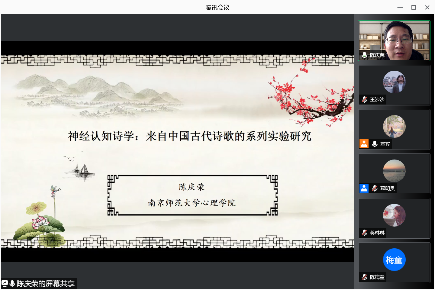 本网讯(教科院 王沙沙)12月5日下午,皖江心理大讲坛第八十七讲线上开讲。南京师范大学心理学院院长陈庆荣教授应邀为我院师生作“神经认知诗学:来自中国古代诗歌系列实验研究”主题讲座。本次讲座基于腾讯会议平台进行,由我院博士生导师宣宾教授主持,葛明贵教授、韩建涛副教授等,以及心理学和心理健康教育专业硕士研究生近100名师生在线聆听。