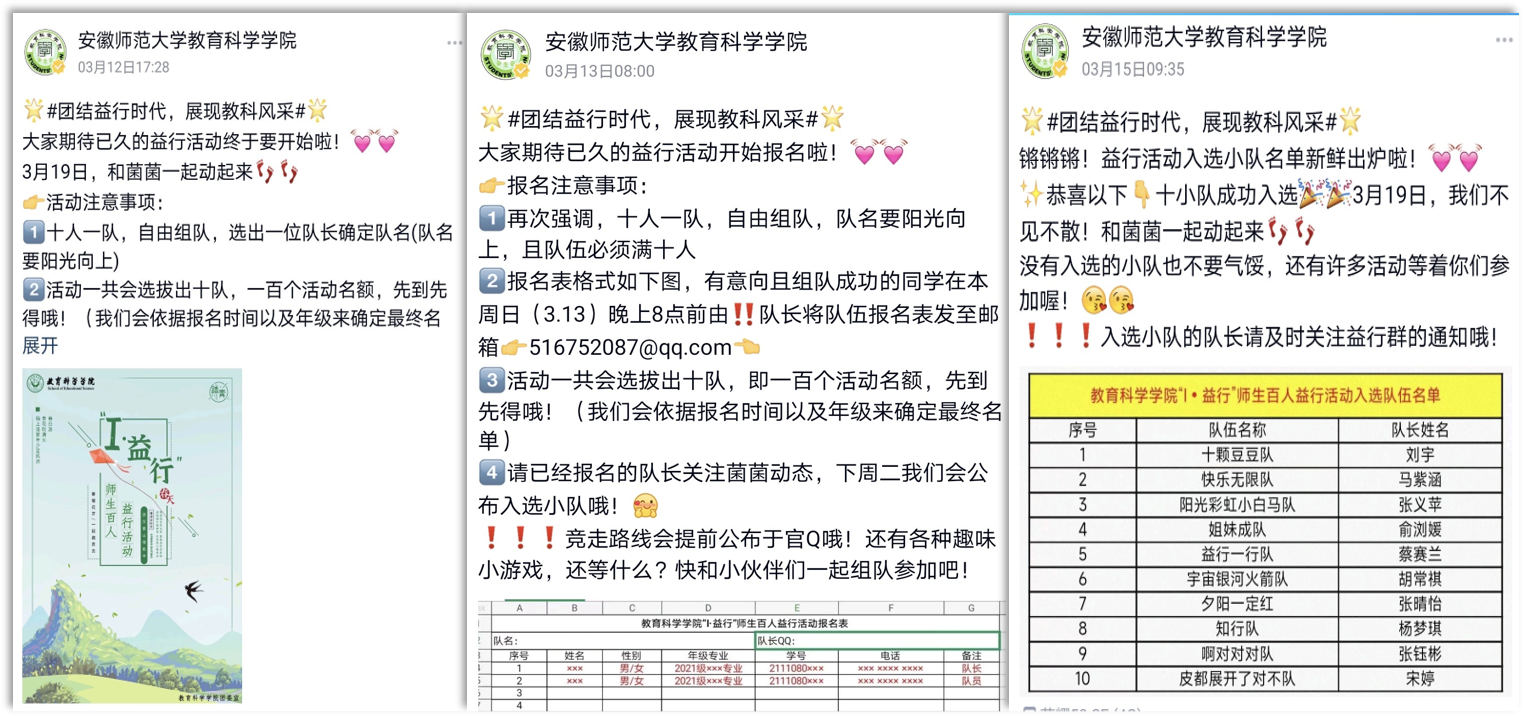 为遵守疫情防控的相关规定,学院将今年益行活动的地点调至校内。在此次益行活动的准备阶段,以线上的方式进行宣传,学院官Q持续推送相关内容对本次活动进行预热。