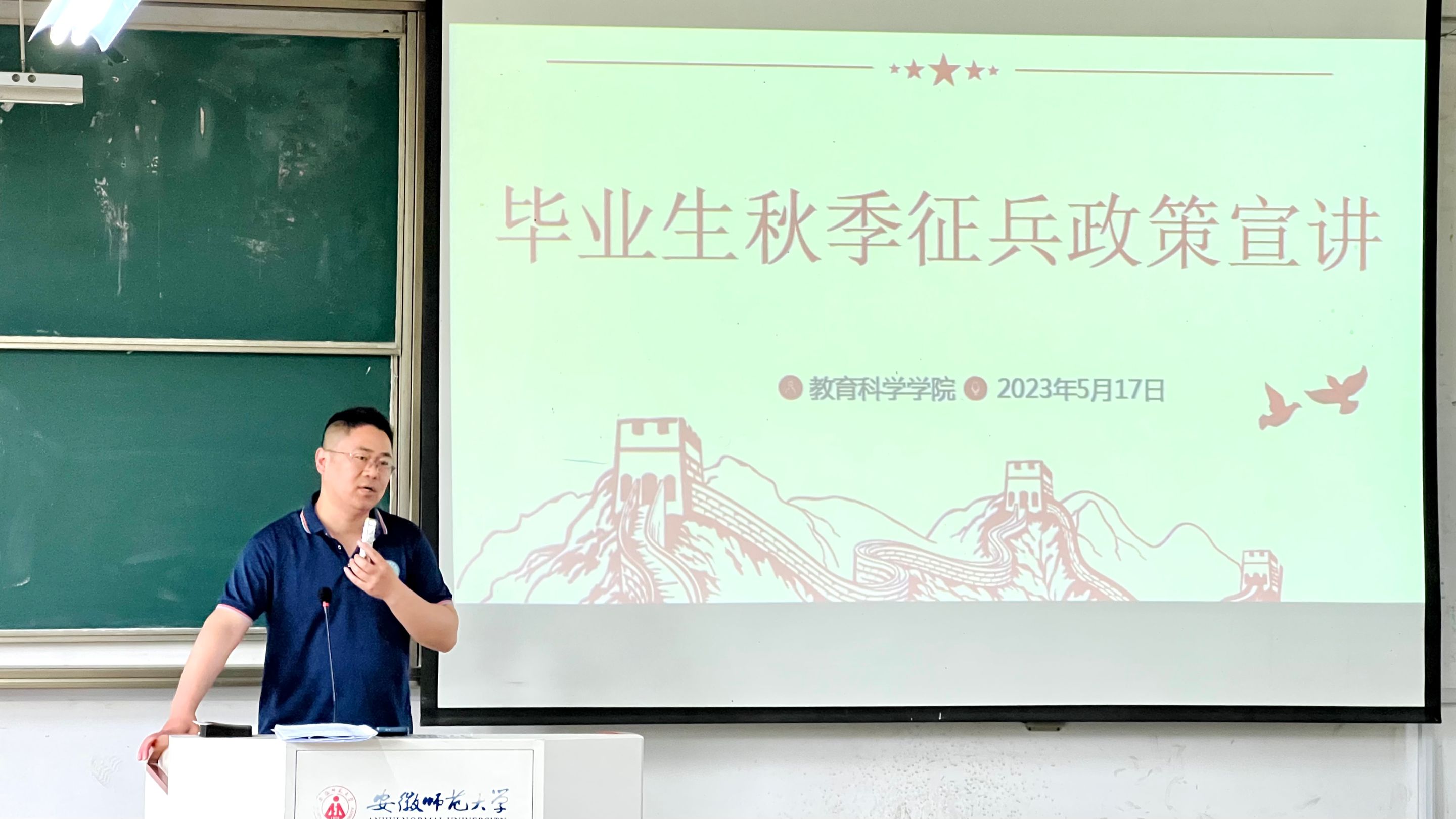 为鼓励教科学子携笔从戎、为国效力,2023年5月17日,学院于田楼8101教室开展毕业生秋季征兵政策宣讲工作,宣讲会线下线上相结合,会议由2019级辅导员莫大贡主持,2019级全体本科毕业生参加。