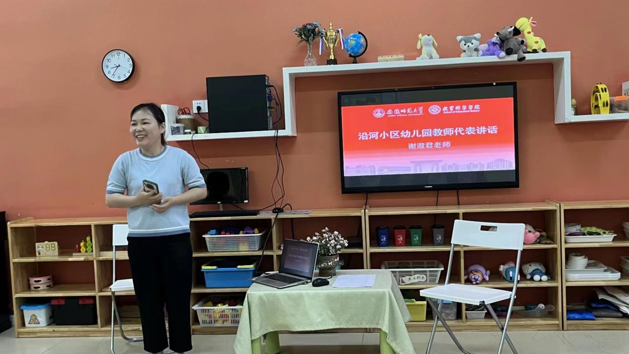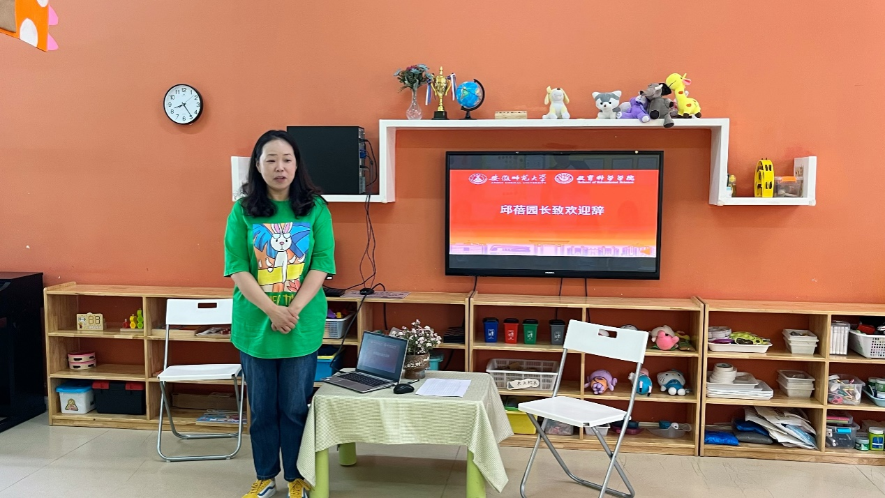 参观过后入园仪式正式开始,邱蓓园长代表沿河小区幼儿园进行发言,她对教科院学前教育专业学生的到来表示热烈欢迎,总结了近年来沿河小区幼儿园的发展历程、班级规模等基本概况,鼓励教科院的学生要与幼儿园教师携手共同学习进步。