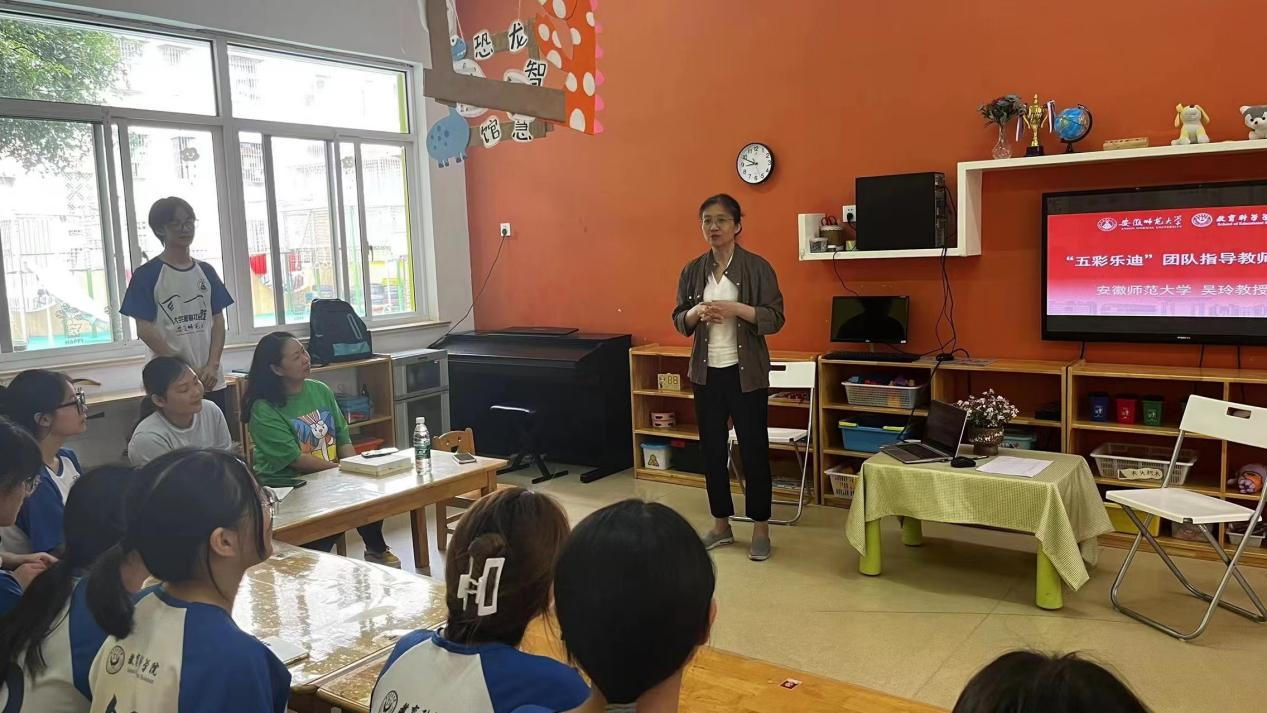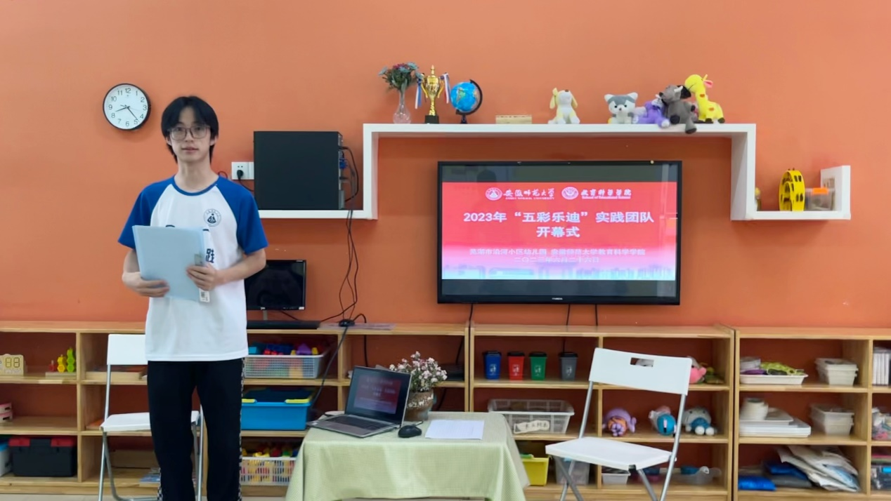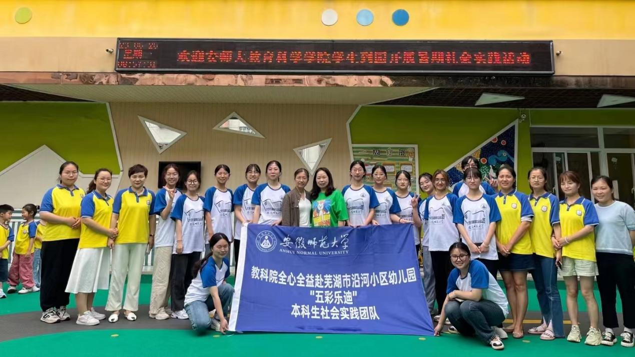 6月26日上午,教科院全心全益赴芜湖市沿河小区幼儿园“五彩乐迪”本科生实践团队15名成员在吴玲教授的带领下首次进入幼儿园举办入园仪式。