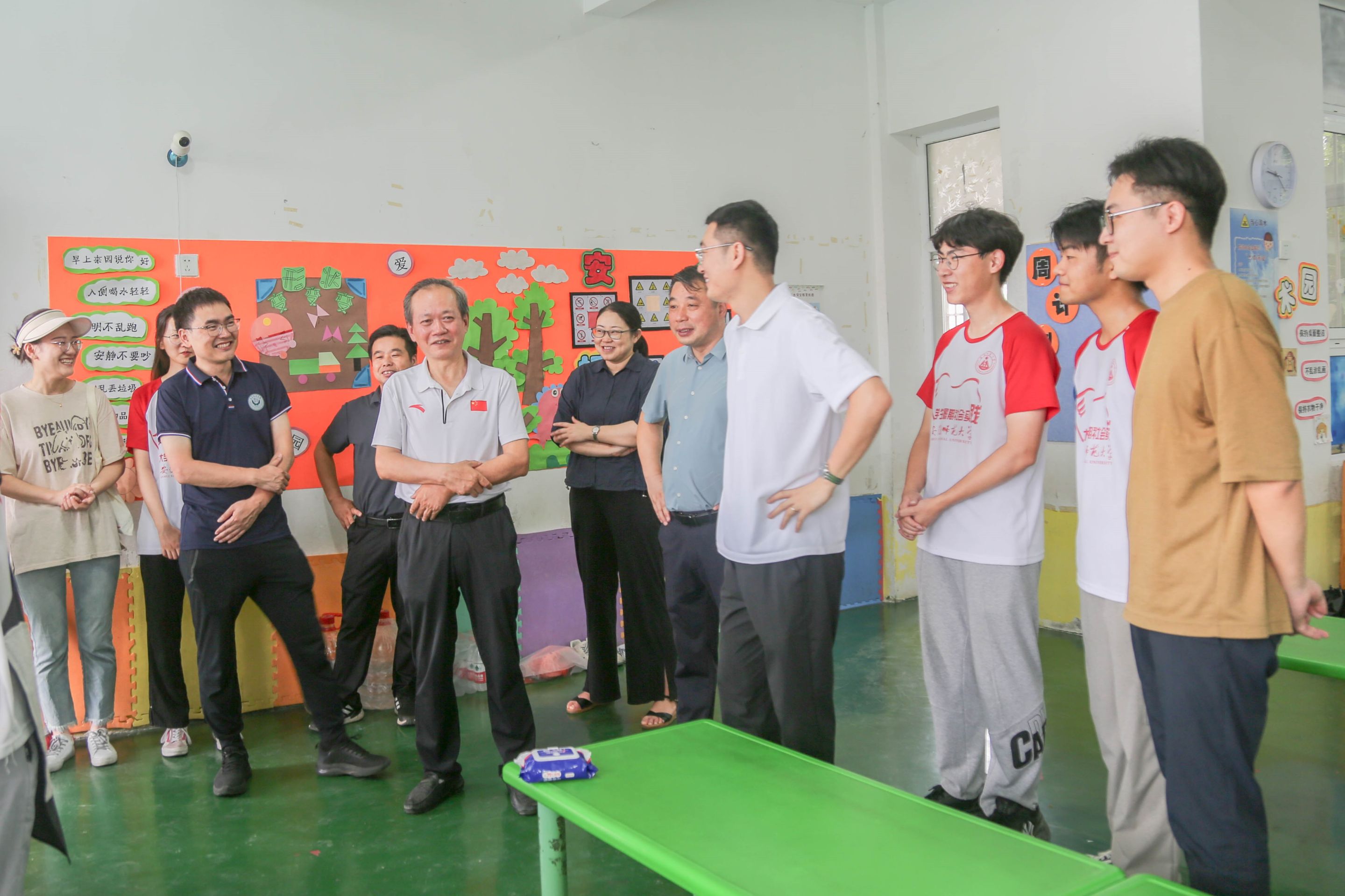 7月13日上午,教育科学学院教授、团队指导教师阮成武,院党委副书记杜凤,副院长韩建涛,学院教师肖龙,院团委书记张理强、辅导员赵茜一行人抵达无为市新河小学,对教科院全心全益赴无为市“皖夏·启梦”本科生实践团队进行走访慰问。福渡中心学校校长许先友,干事许圣军,新河小学校长张弢陪同慰问。
