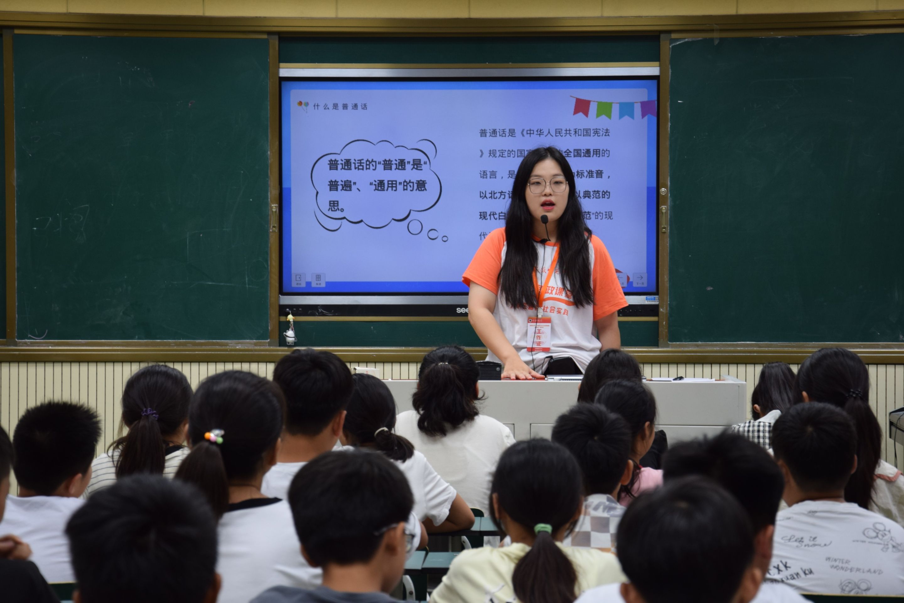 课程首先以“什么是普通话”进行问题引入,引导学生思考普通话的内在含义,进一步强调讲好普通话的重要性,让学生们充分认识到推广普通话的作用和意义。此外,团队以普通话在乡村普及程度的现状为依据,结合青少年课堂学习的特点,在课程实施阶段设置了经典诗词朗诵和趣味绕口令环节,让学生在轻松愉悦的课堂氛围中学习普通话、练习普通话。课程结束后,授课老师马紫涵表示:“本次课程中同学们表现得非常积极,可以看出他们对普通话的学习抱有极大的热情,希望他们在接下来的学习生活中能够继续带着这份热情,让普通话真正融入生活的方方面面。”