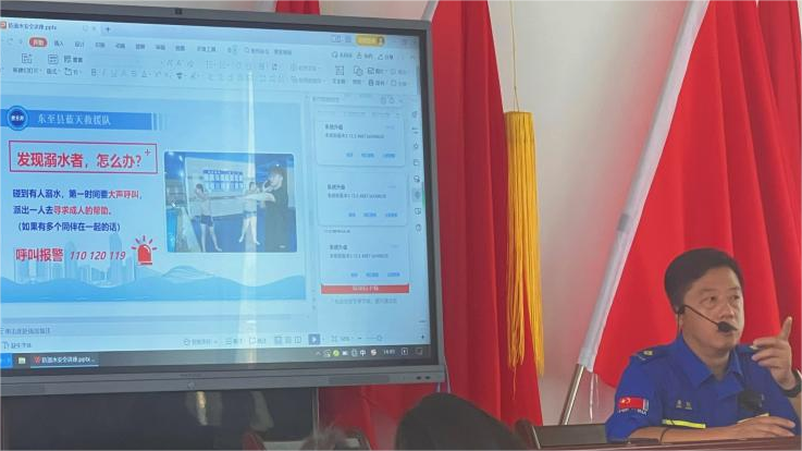 蓝天救援队的老师通过图片呈现的方式向同学们介绍了水库、河流、溪边、水坑、城市内涝、游泳池六个危险水域,并强调学生们暑期游泳需要有家长陪同并选择正规、安全的游泳场所。实践团队队员胡佳佳带领学生们朗读并熟记防溺水安全“六不准”原则,让学生树立自觉远离野外危险水域,严禁擅自下水游泳的意识。
