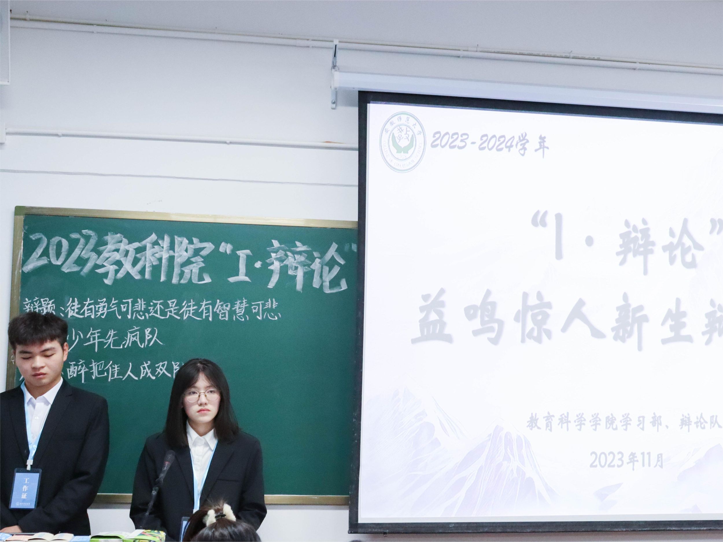 2023年11月19日晚,教育科学学院于天门山校区北教学楼310举办“I·辩论”辩论赛决赛。院团委书记付银行,2023级辅导员金凤仙、刘玉瑾,教科院辩论队队长岳辰硕、副队长朱雨阳为本次比赛评委。