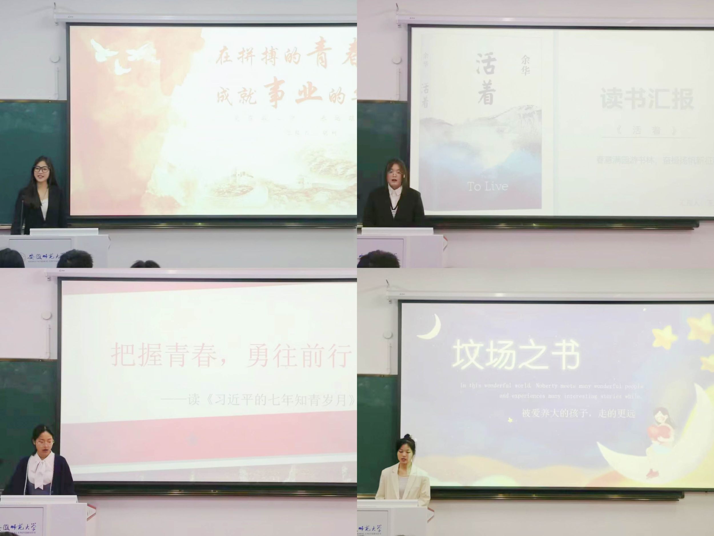 经过初赛复赛的层层筛选,共有八名同学晋级决赛。八名选手依次上台汇报自己的读书感悟,《习近平的七年知青岁月》《活着》《平凡的世界》《坟场之书》......每位汇报人结合ppt围绕所介绍的书籍侃侃而谈,通过简练的语句、自信的讲解向观众传达出书籍的魅力,高度弘扬文化自信。每场汇报结束后,选手及其亲友团成员还进行了“你划我猜”游戏环节,以默契会友,将整场比赛氛围带到一个高潮,缓解比赛紧张氛围的同时又提高了观众的参与度。