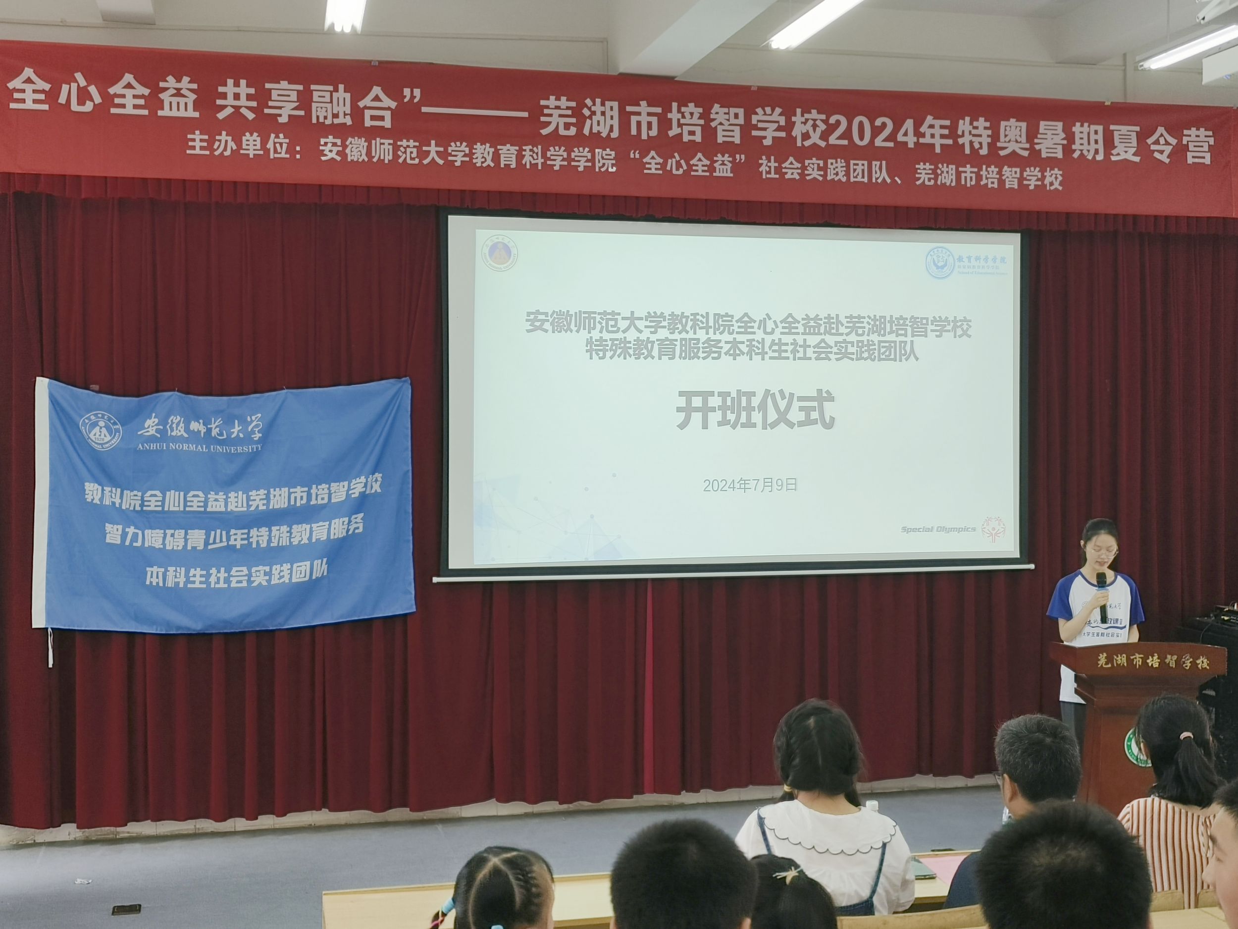 青春献特教,培智育新芽。为关爱特殊教育青少年群体,贡献大学生青春力量,助推国际特奥项目的开展,教育科学学院“全心全益”赴芜湖培智学校暑期社会实践团队顺利举行开班仪式,帮助18名智力障碍青少年生涯启航,提升个人素养,促进健康成长。