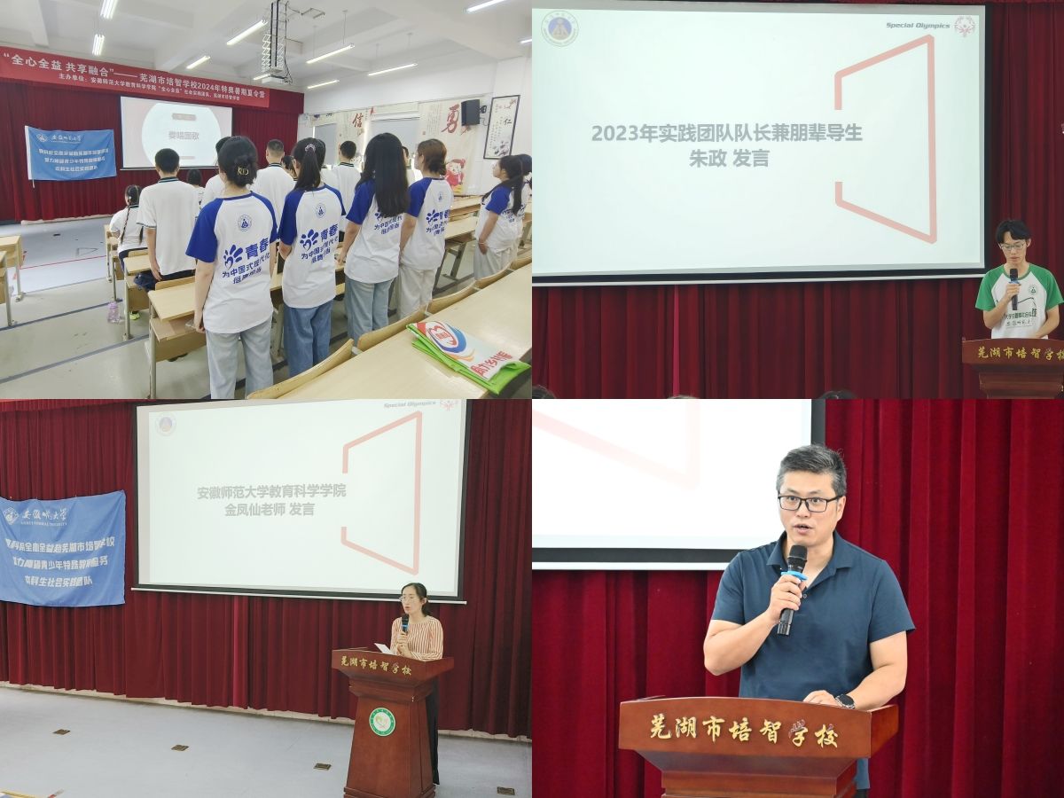 7月9日下午,实践团队于芜湖市培智学校阶梯教室正式举行开班仪式,团队指导老师金凤仙、芜湖市培智学校团支部书记张康、2023年实践团队队长兼朋辈导生朱政、培智学校参加活动全体学生以及实践团队全体队员参与本次开班仪式。