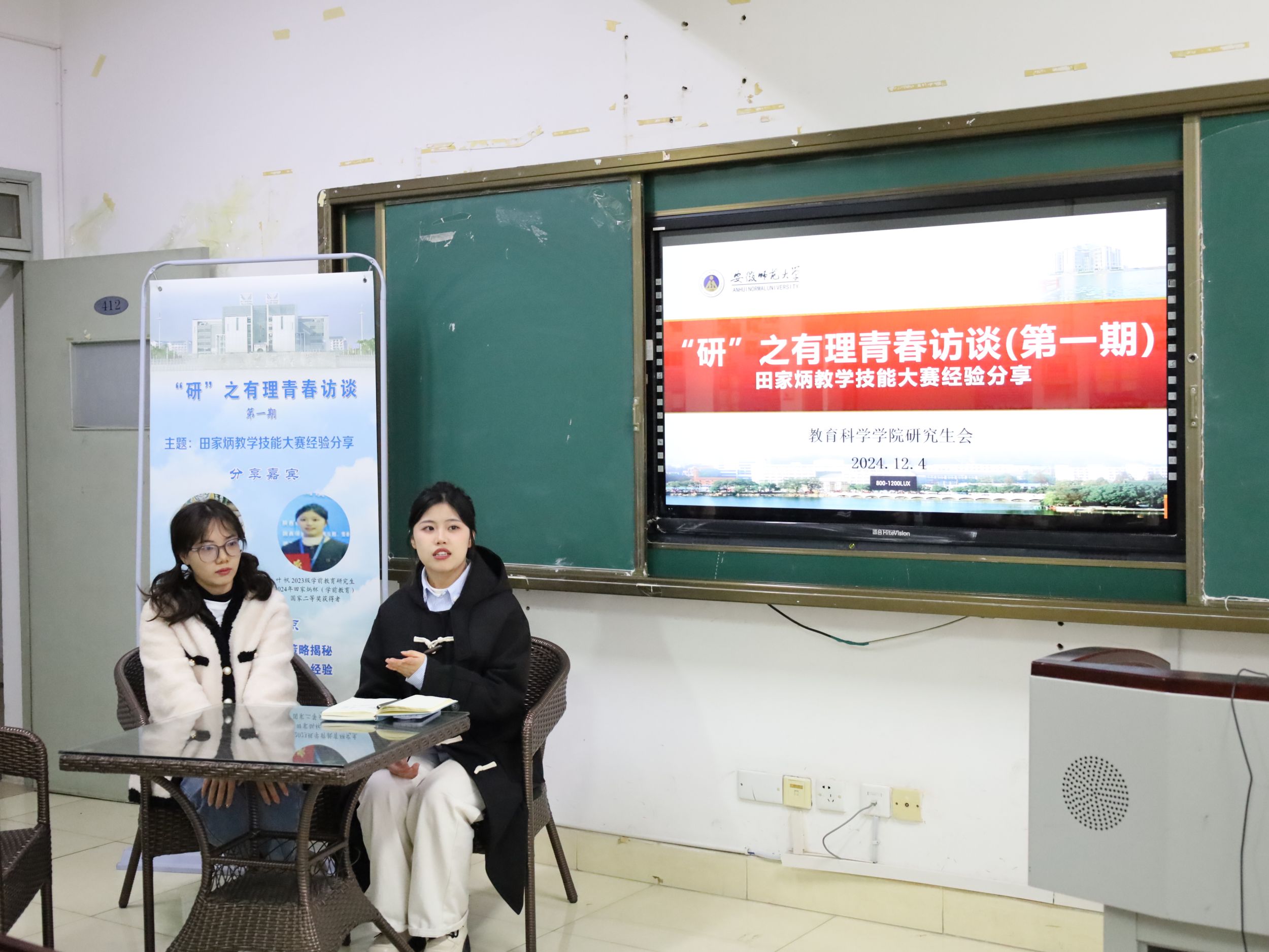 “零距离”交流,“面对面”解惑。12月4日下午,“研”之有理青春访谈第一期,于教科院412教室开讲。本期邀请到2023年田家炳杯(小学教育)国家一等奖获得者、2022级小学教育专业研究生俞晓雨,2024年田家炳杯(学前教育)国家二等奖获得者、2023级学前教育专业研究生叶帆,学院研究生会指导教师、研究生辅导员莫大贡参加本次活动。活动由2024级现代教育技术专业研究生音锐主持,学院2024级小学教育专业、学前教育专业研究生到场学习。