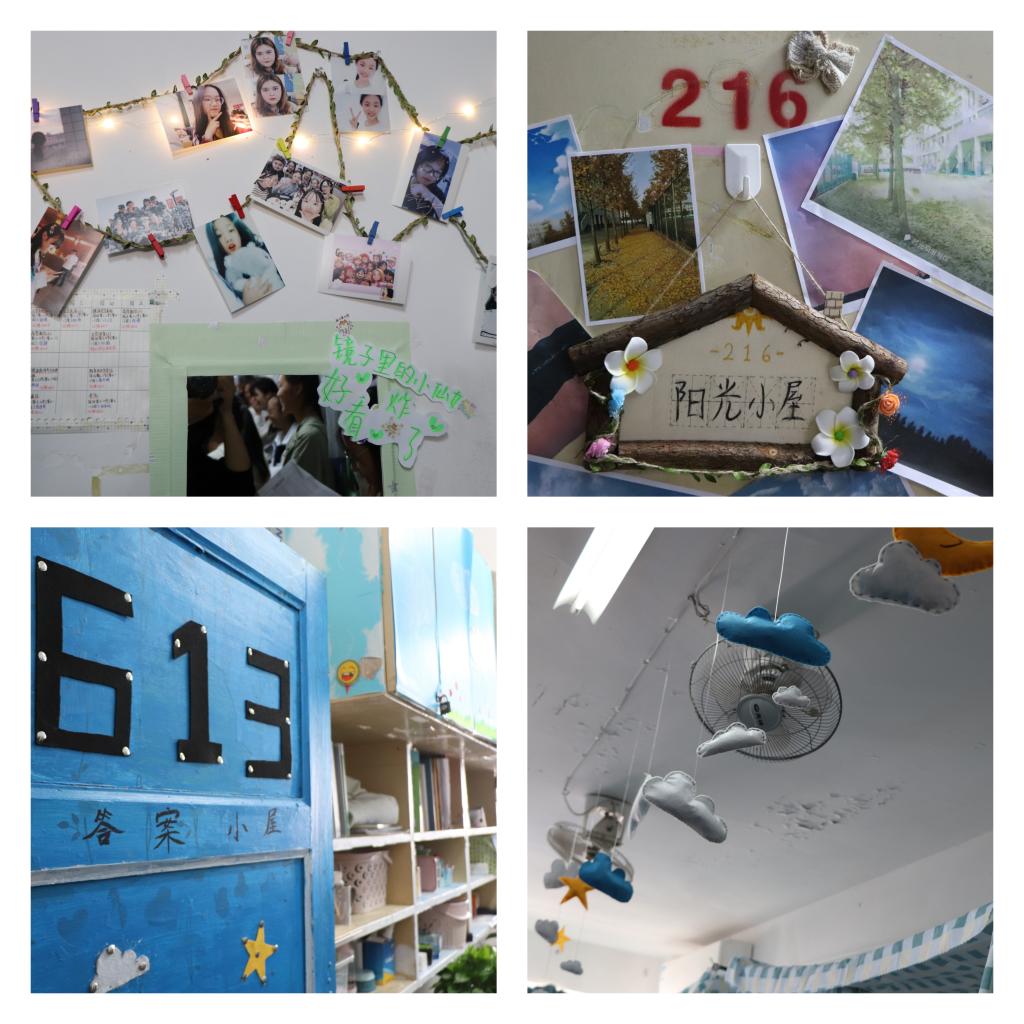 除了整体感观之外,同学们对细节处理也尤为看重。门上的寝室牌传递了同学间友好的交往方式,墙壁上的照片记录了寝室的快乐时光,天花板上的布偶千纸鹤营造了温馨的氛围。天空白云的玩偶、四叶草幸运的贴纸、桌上的复习资料等等都是大学生生活的写照,不仅有心旷神怡的放松时刻,也有奋战刻苦的求学之路。一张一弛,劳逸结合才能度过短暂而美好的大学生活。后期评委将会秉承着公平公正的原则择出“最美寝室”。
