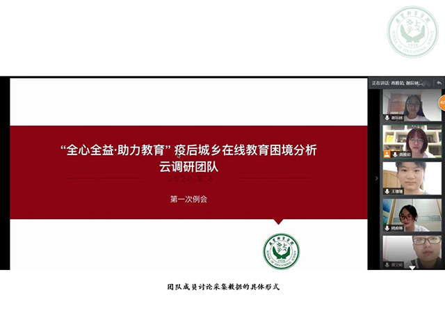 本网讯(教科院 王珊珊)启动云端调研,助力城乡教育。为帮助团队成员明确调研方向、熟悉调研程序,保证后期调研活动顺利进行,教科院“全心全益·助力教育”疫后城乡在线教育困境云调研团队队长高雅茹同学于8月6日晚八点通过腾讯会议平台召开了实践启动会议,团队全体成员准时参与会议。