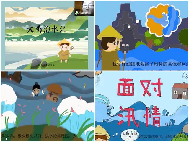 团队结合时情,帮助儿童了解近期汛情,使其体会到前线消防官兵与志愿者们抢险救灾的辛苦付出、无私无畏的宝贵品质,18级学前教育专业的傅星、黄婉琪、戴国强作为主持人,带领孩子们进入绘本的知识海洋中。队员们首先从今年的雨水频繁引发灾害作为切入点,了解幼儿生活中的变化,从而拉近彼此之间的距离。团队利用线上线下相结合方式完成了绘本绘制并且制作出有声视频,将其投放在家长群中,幼儿可以随时进行观看。此外,志愿者还带领学生穿梭时间来到古代,学习大禹治水的故事,从大禹如何治水到学习大禹不怕吃苦、大公无私的精神。