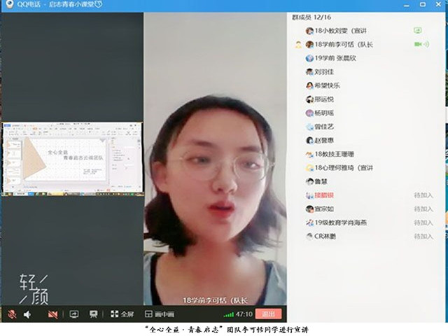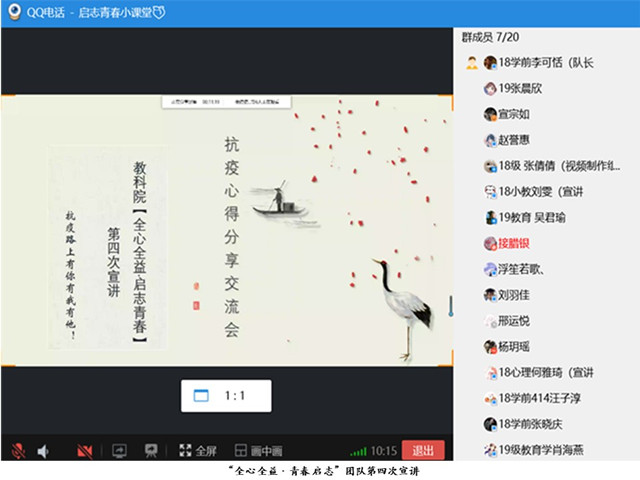 8月18日晚七点,“全心全益·青春启志”团队正式召开第一次主题宣讲活动。主持人18级学前教育专业李可恬以疫情的心得体会为切入点,回顾了疫情初期的恐慌和我国有效的抗疫措施,并由衷地为全国齐心协力、共克时艰的精神点赞。接着,18级学前教育专业张倩倩分享了此次疫情给人们的生活造成的众多影响,比如部分个体商户从辉煌走向寥落,居民禁止走亲访友等。