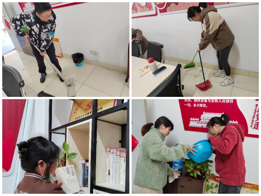 为响应雷锋月,支部成员组织了教室志愿清扫服务。8303教室是学前教育专业考研常用复习教室,第三党小组成员在不打扰同学们备考的前提下,认真打扫教室卫生,为同学们带来干净整洁的备考环境。