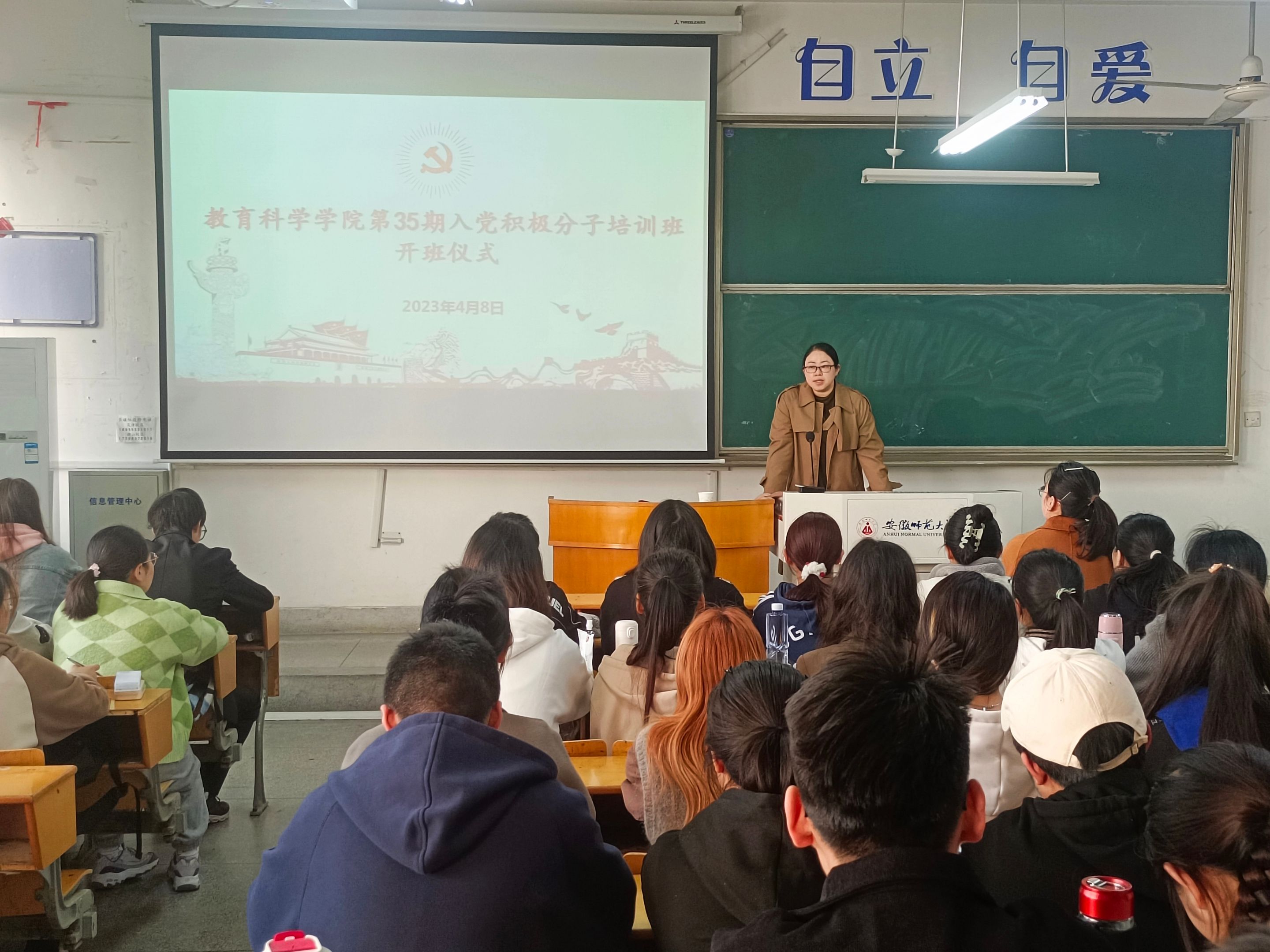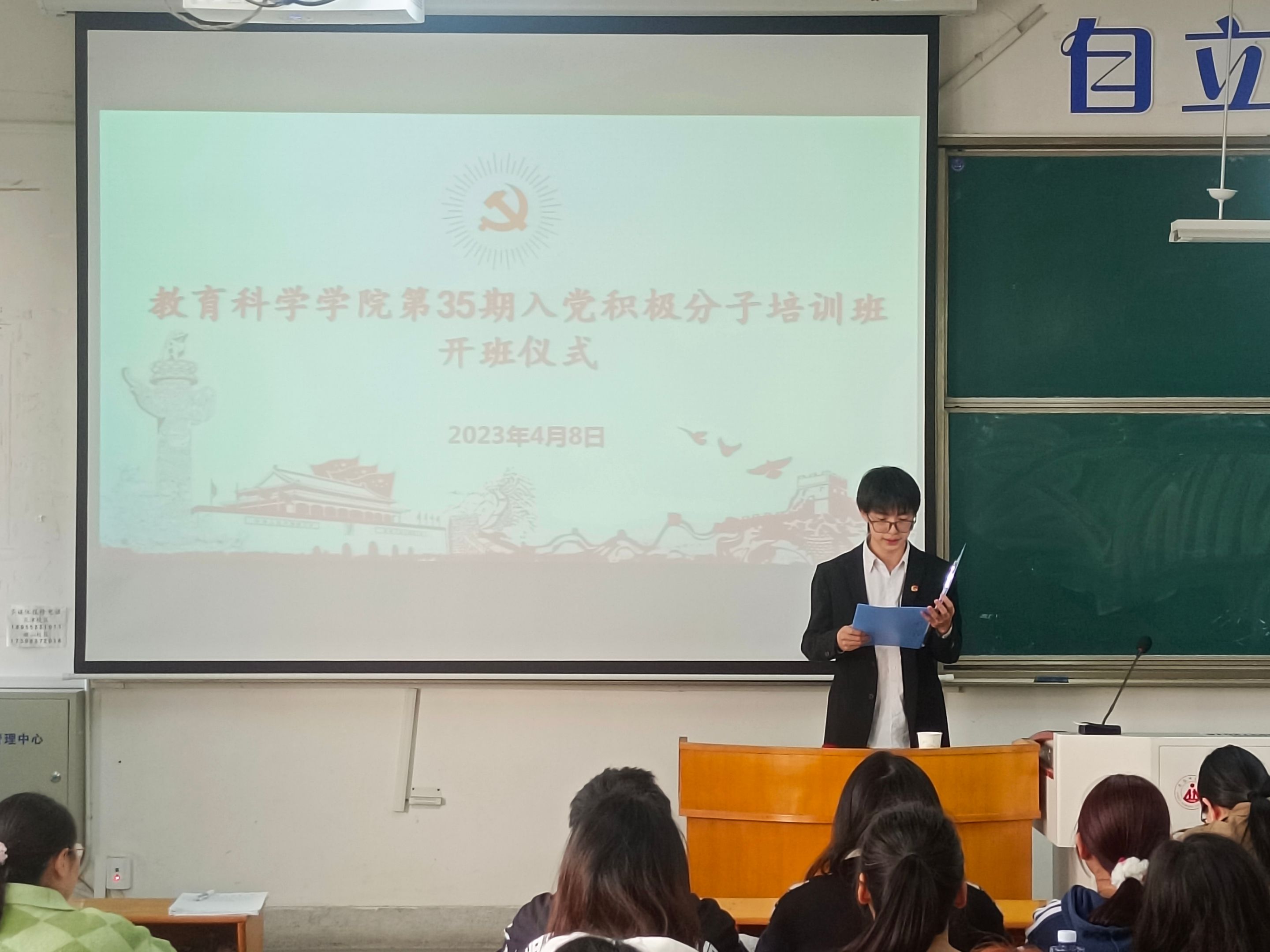 为进一步提高入党积极分子的党性修养,厚实党的理论知识,端正入党动机。4月8日上午8点,教育科学学院第35期入党积极分子培训班开班典礼在田楼8210教室举行。院党委副书记杜凤、班主任赵茜以及本期培训班全体学员出席开班式。