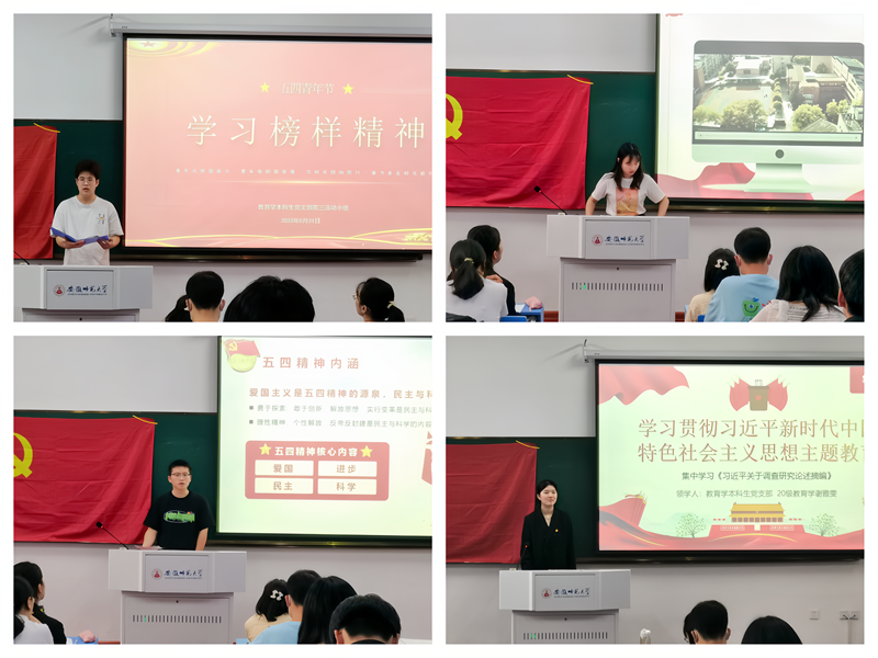 在“榜样精神”专题学习会环节,教育学本科生党支部第三活动小组领学“五四青年之光,学习榜样精神”的专题学习。胡钰昆围绕“什么是五四精神”“五四精神的当代体现”“当代青年如何传承五四精神”三大部分进行汇报,他呼吁大家要坚定信念,用奋斗为青春添彩,用知识为青春赋能。李佳欣和大家分享了“五四青年奖章”获得者及其先进事迹,重点介绍了第27届“中国青年五四奖章”获得者张晨同志的志愿事迹,旨在弘扬优秀榜样精神,鼓励大家坚定信念勇毅前行。