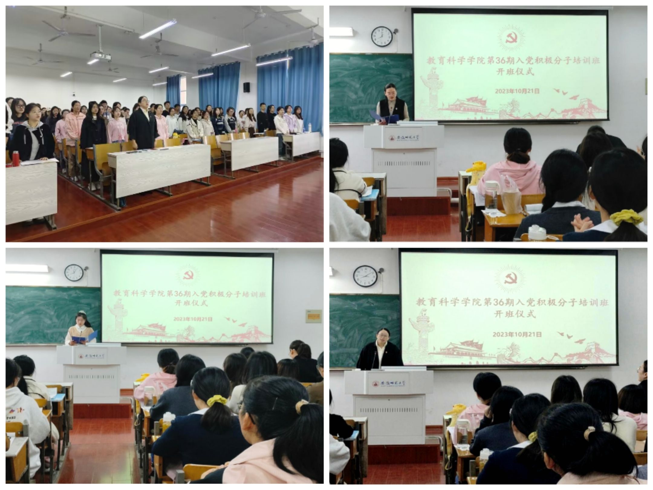 为进一步提高入党积极分子的思想政治觉悟,端正入党动机,增强党性修养。10月21日上午8点,教育科学学院第36期入党积极分子培训班开班典礼在教学楼1311教室举行。院党委副书记杜凤、班主任赵茜以及本期培训班全体学员出席开班式。