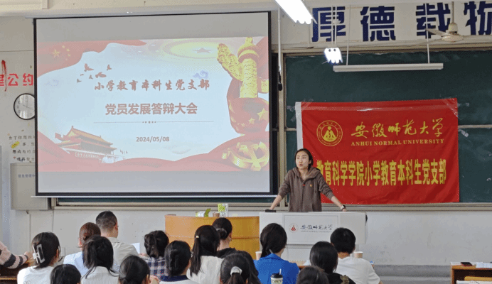为进一步考察入党积极分子的政治素质和综合素养,把好发展好党员“入口关”,吸纳更多政治素养高、先锋模范作用强的优秀人才向党组织靠拢。2024年5月8日下午,教育科学学院小学教育本科生党支部于田楼8202教室召开了2024年上半年党员发展答辩大会,教育科学学院党委委员、行政副院长何海燕,党支部副书记莫大贡和支部全体学生党员、入党积极分子参与现场评议工作。会议由小学教育本科生党支部书记程雅楠主持。