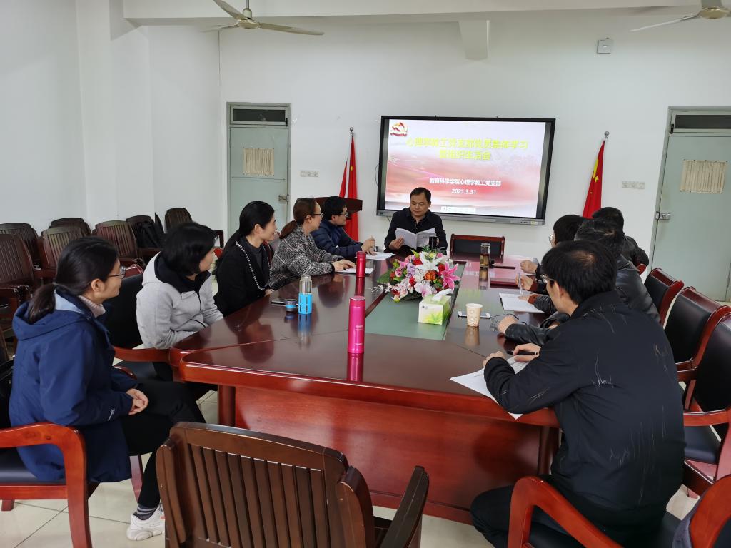 本网讯(心理学教工党支部)近日,心理学教工党支部在专业会议室(308室)开展党史学习教育,专题学习习近平总书记在党史学习教育动员大会上的重要讲话精神、高校违纪违法警示教育及学院党史学习教育实施方案等。活动由支部书记韩建涛主持,院党委委员、副院长辛治洋列席,支部全体党员教师出席。