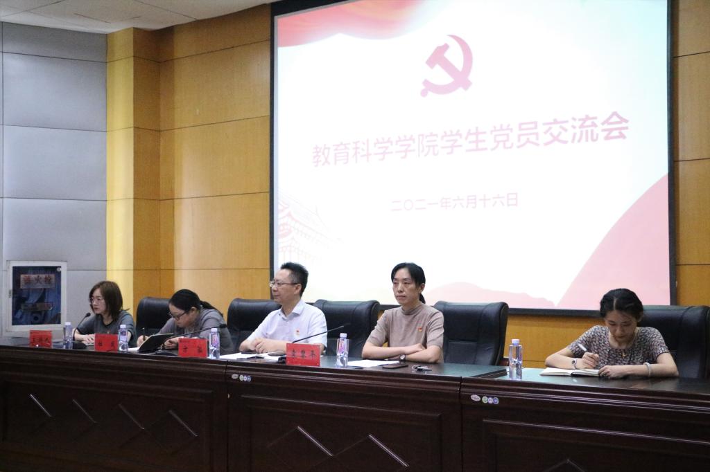 本网讯(教科院 曾可伊)为致敬中国共产党成立100周年,提升学生党员的党性修养,2021年6月16日下午,教育科学学院于田家炳教育书院三楼报告厅开展学生党员交流会。院党委书记方泓、党委副书记杜凤、党委秘书袁黎平、心理学本科生党支部书记、2017级辅导员谭茹轩、全体毕业班党员以及2021年上半年新发展党员参与了本次会议。学前教育本科生党支部书记、2020级辅导员蔡文主持交流会。