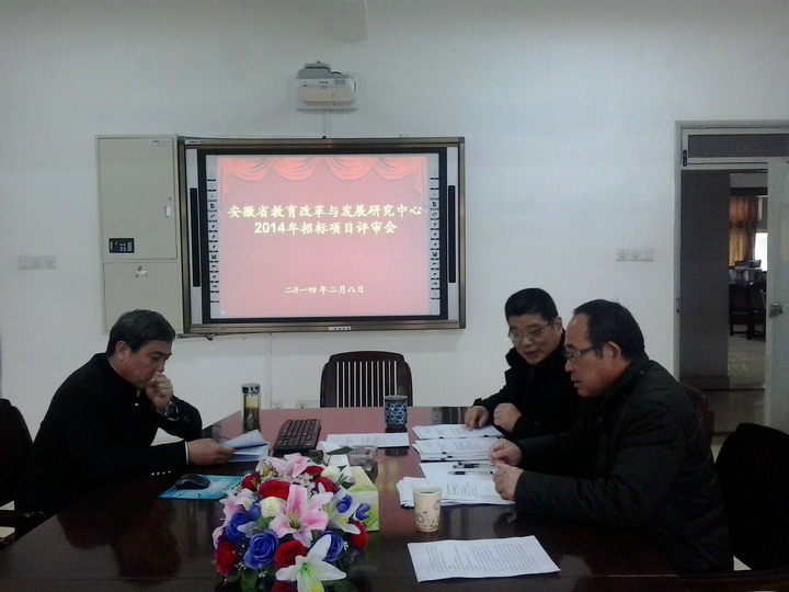 本网讯(马兴)28日下午,安徽省教育改革与发展研究中心2014年重点招标项目评审会在安徽royal皇家88平台举行。基地常务主任朱家存教授、基地副主任葛明贵教授和周兴国教授参加了此次评审会。